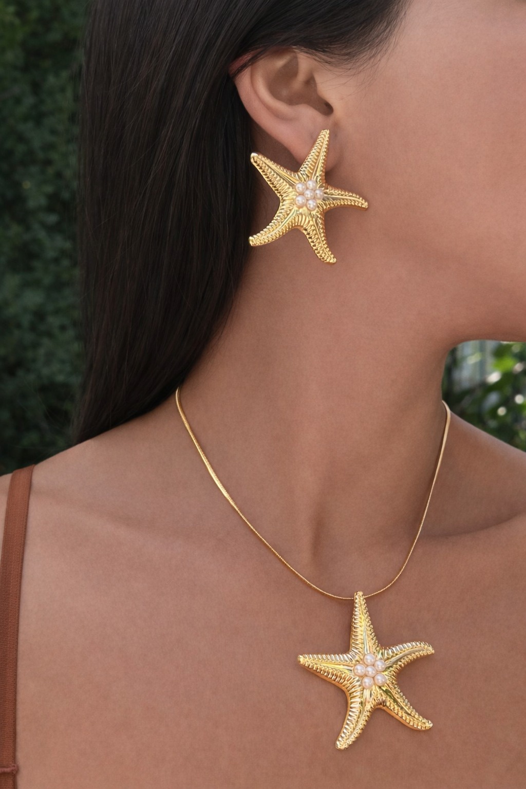 El Set Estrella Dorada Perla es una celebración del lujo natural inspirado en el mar. Compuesto por un delicado collar con dije de estrella de mar y aros a juego, ambos bañados en oro 18K antioxidante y realzados con perlas iridiscentes al centro, este conjunto transmite elegancia, frescura y sofisticación atemporal.
